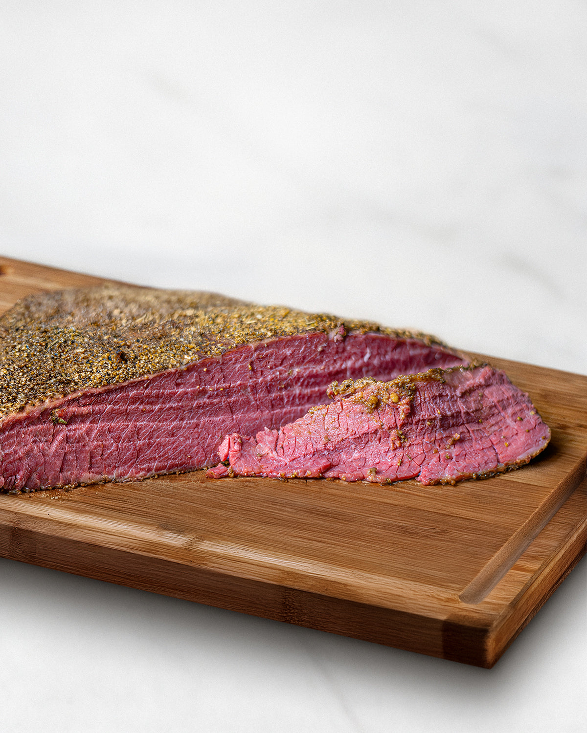 Die zarte Wagyu Pastrami von unserem Fullblood Wagyu-Rind vereint traditionelle Pastrami-Herstellung mit der außergewöhnlichen Qualität von Wagyu Rindfleisch. Durch die feine Marmorierung entsteht ein besonders zartes & saftiges Pastrami mit intensivem Geschmack und einer unverwechselbaren Textur. Das Fleisch wird sorgfältig gepökelt, mit aromatischen Gewürzen veredelt und anschließend langsam gegart, wodurch das typische würzige Pastrami-Aroma entsteht.