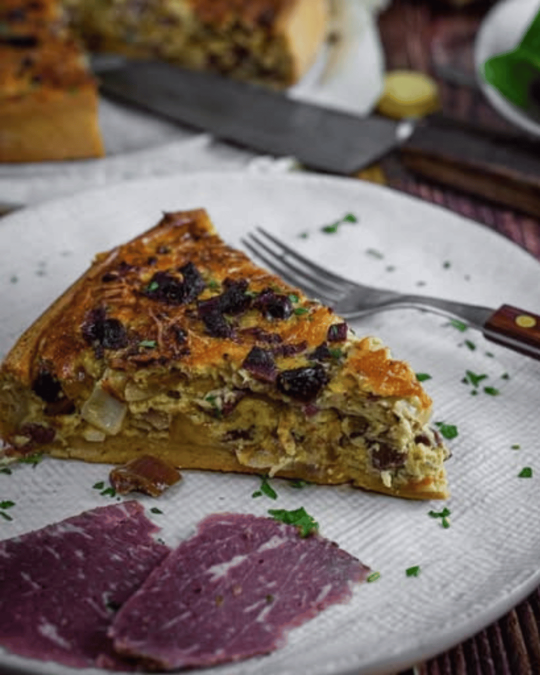 Nachtisch mit Wagyu Pastrami, fein aufgeschnitten, mit Kuchen serviert, Fullblood Wagyu
